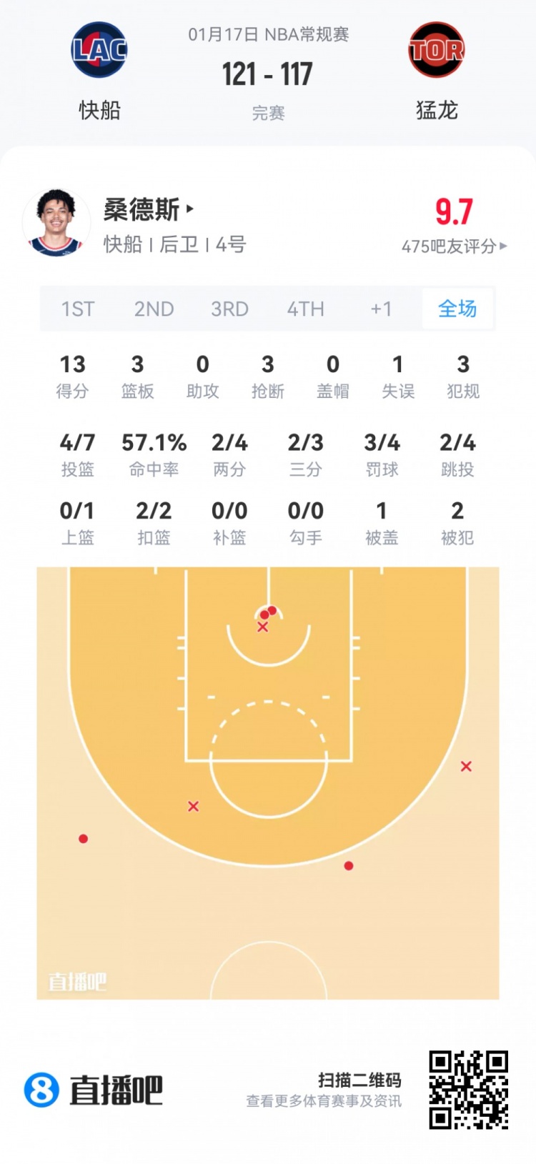 快船次轮50号秀科比·桑德斯 登场36.7分钟